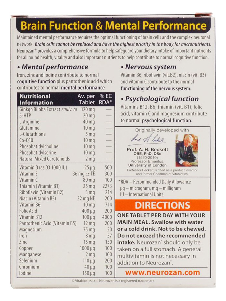 دارای مواد فعالی همچون عصاره جینکو بیلوبا، کوآنزیم کیوتن، آرژینین، -HTP و فسفاتیدیل سرین