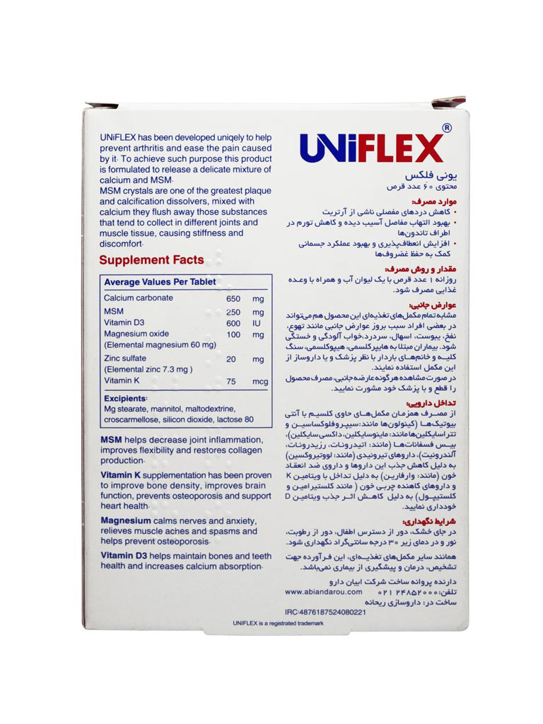 حاوی کلسیم، MSM، ویتامین D و زینک، تقویت کننده استحکام استخوان ها، تسکین دهنده دردهای مفصلی و التهاب مفاصل