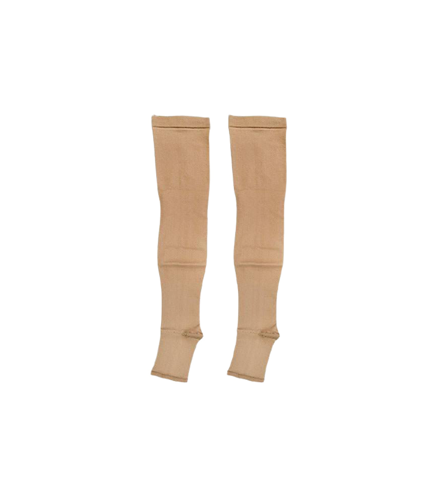 جوراب واریس طرح سوئیسی پاک سمن کد 025 بالای زانو با کف را بپوشید، به طوری که جوراب روی رگ های واریسی قرار گیرد.