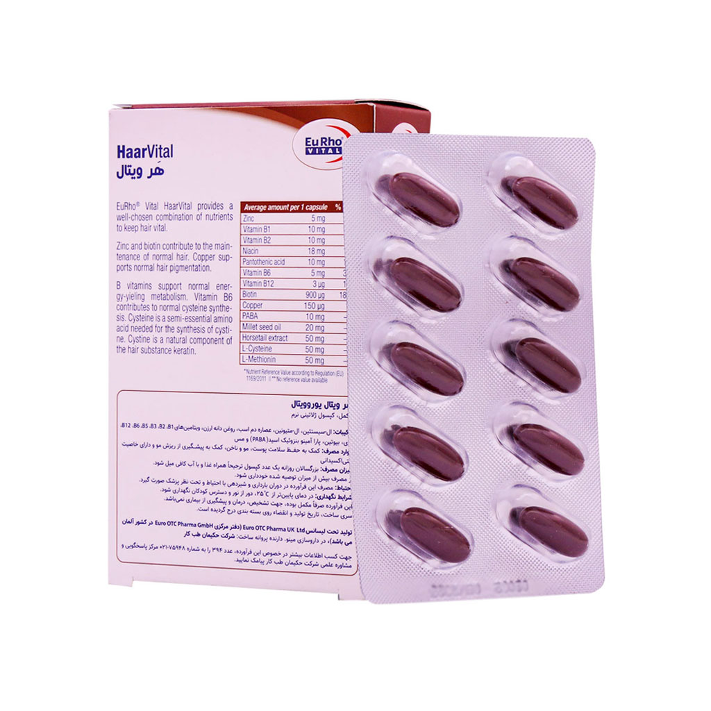 سافت ژل هر ویتال یوروویتال یکی از مکمل های تخصصی مو محسوب می شود که تحت لیسانس شرکت Euro OTC Pharma GmbH کشور آلمان قرار دارد. البته این محصول در ایران بسته بندی می شود و دارای پروانه ساخت شرکت حکیمان طب کار است. کپسول مورد نظر، مکمل کمک تغذیه ای است که در ترکیبات آن عصاره های گیاهی ارزشمندی همچون گیاه دم اسبی، پابا و روغن دانه ارزن وجود دارد. همچنین این مکمل دارای آمینو اسیدهای مفید بدن، مس، زینک و ویتامین های گروه B است که همگی این ترکیبات در حفظ سلامت پوست و مو نقش مهمی را ایفا می کنند.