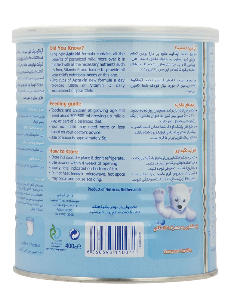 شیر خشک آپتاکید نوتریشیا حجم 400 گرم مناسب برای کودکان بالای 3 سال