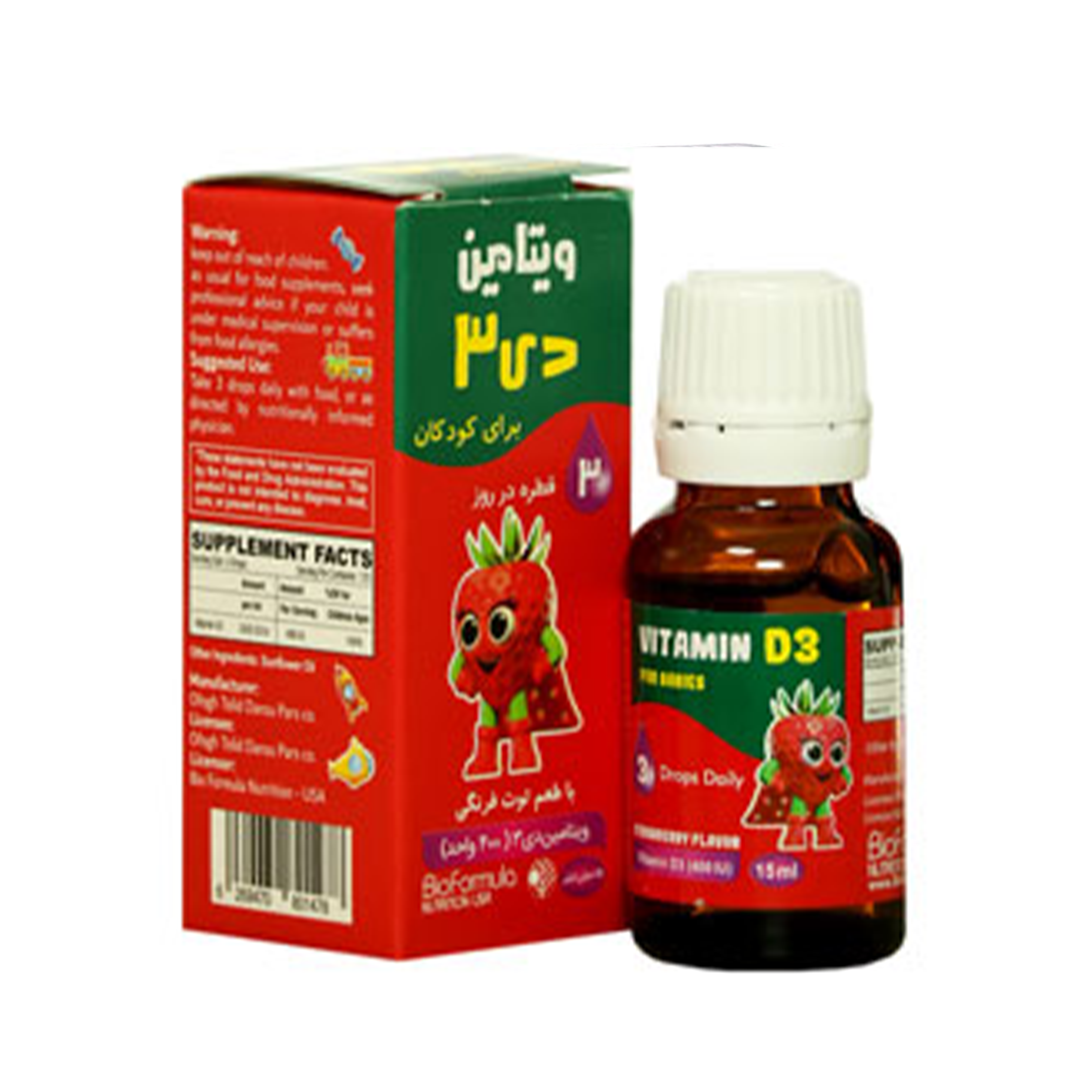قطره ویتامین د3 کودکان 400 واحدی بایو فرمولا طعم توت فرنگی حجم 15 میلی لیتر