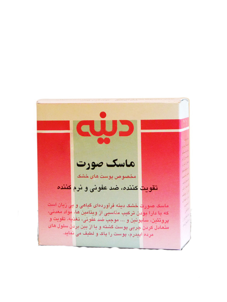 هفته ای یک یا دو نوبت، یک قاشق چایخوری از ماسک صورت پوست خشک دینه را با آبمیوه تازه یا آب جوشیده مخلوط نمایید و تمام قسمت های صورت (بجز اطراف چشم) را با قشر نازکی از آن بپوشانید و پس از ده دقیقه با آب گرم شتسشو دهید.
