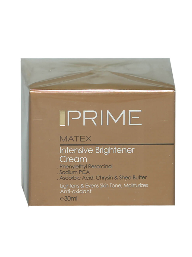 کرم روشن کننده پریم مدل Intensive از سری Matex، یک محصول کاربردی برای روشن کردن و یکنواخت کردن رنگ پوست است. این محصول، دارای ترکیباتی نظیر فنیل اتیل رزورسینول، ویتامین C و کره شی می باشد. فنیل اتیل رزورسینول در ترکیبات این روشن کننده، نقش هیدروکینون رو ایفا می کند و با مهار آنزیم تیروزیناز، از تولید ملانین جلوگیری می کند و در عین حال، عوارض هیدروکینون را ندارد. به این ترتیب، پوست روشن تر شده و از ایجاد لک های پوستی جلوگیری می شود. ویتامین C به کار رفته در این محصول نیز پوست را روشن تر کرده و به کرم خواص آنتی اکسیدانی می بخشد، گرچه بهتر بود شرکت پریم از فرم های پایدار ویتامین C در ساخت آن استفاده می کرد. شی باتر نیز حاوی اسیدهای چرب و ویتامین های مختلف بوده و پوست را به خوبی مرطوب، نرم و لطیف می سازد.