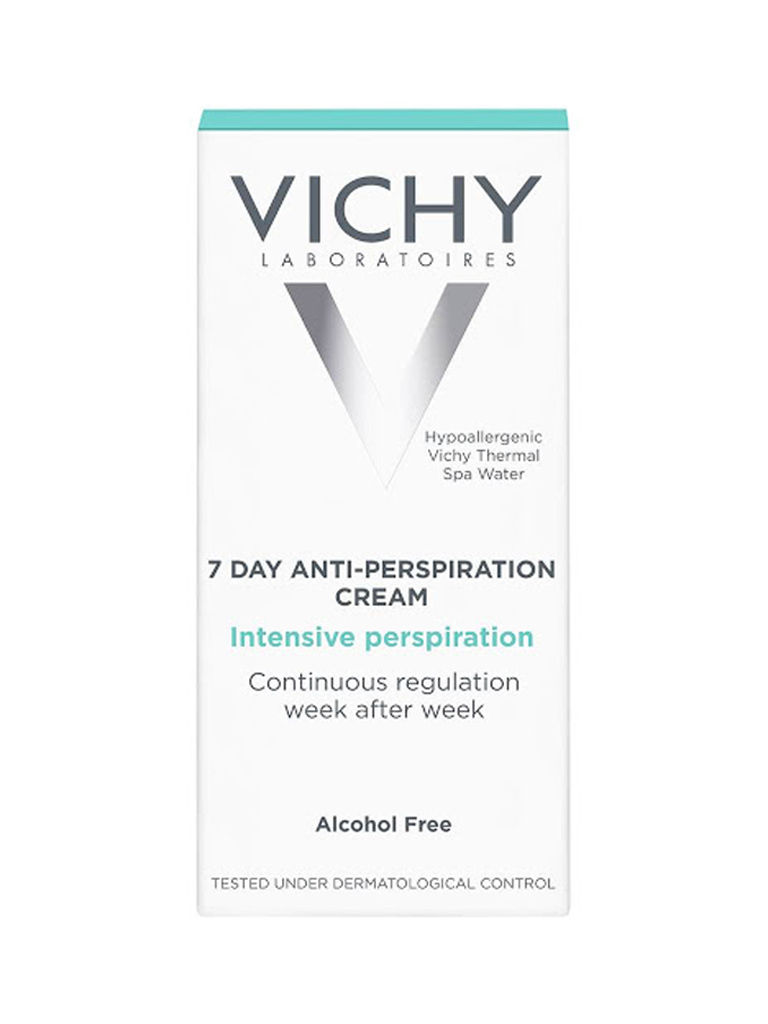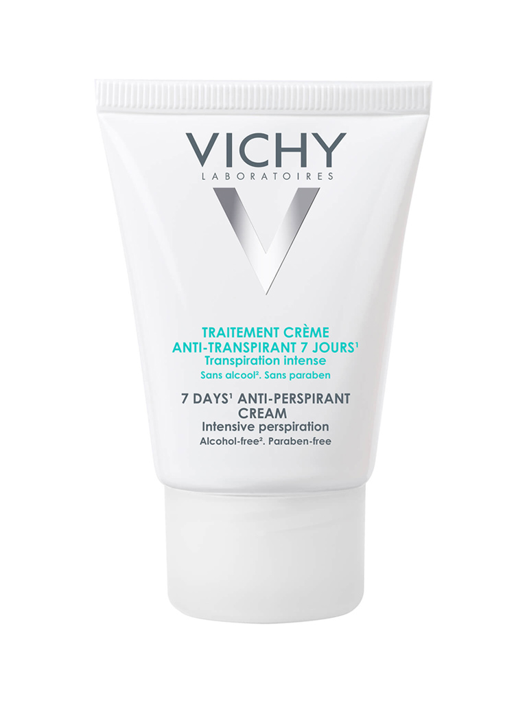 کرم ضد تعریق 7 روزه دئودورانت ویشی را روی پوست تمیز و خشک زیر بغل بمالید.