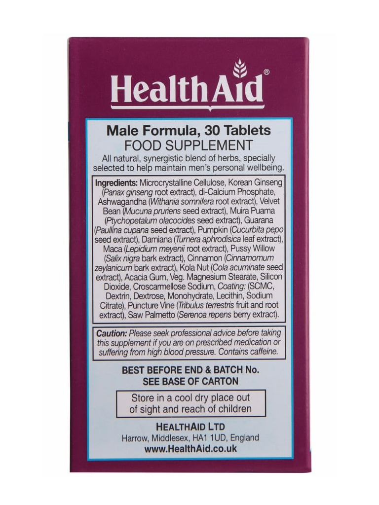 Microcrystalline Cellulose, Korean Ginseng (Panax ginseng root extract), di-Calcium Phosphate, Ashwagandha (Withania somnifera root extract), Velvet Bean (Mucuna pruriens seed extract), Muira Puama (Ptychopetalum olacocides seed extract), Guarana (Paullina cupana seed extract), Pumpkin (Cucurbita pepo seed extract), Damiana (Turnera aphrodisica leaf extract), Maca (Lepidium meyenii root extract), Pussy Willow (Salix nigra bark extract), Cinnamon (Cinnamomum zeylanicum bark extract), Kola Nut (Cola acuminate seed extract), Acacia Gum, Veg. Magnesium Stearate, Silicon Dioxide, Croscarmellose Sodium, Coating: (SCMC, Dextrin, Dextrose, Monohydrate, Lecithin, Sodium Citrate), Puncture Vine (Tribulus terrestris fruit and root extract), Saw Palmetto (Serenoa repens berry extract).
