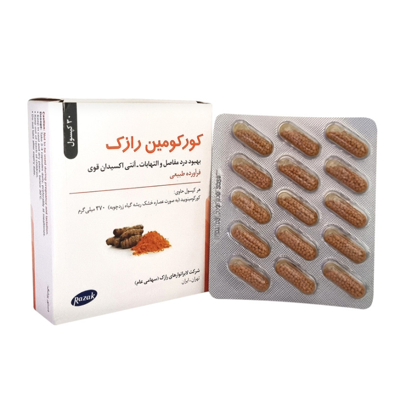 کپسول کورکومین رازک حاوی عصاره زردچوبه بوده و دارای خاصیت آنتی اکسیدانی قوی است. استفاده از این کپسول به بهبود درد و التهاب مفاصل کمک میکند.